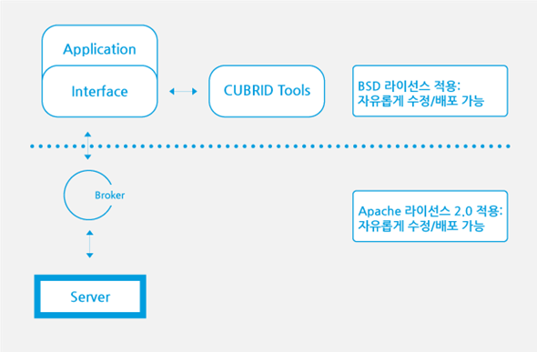 CUBRID의 라이선스는 서버(Apache)와 인터페이스(BSD)로 구분되어 있고, 사용자가 부담 없이 사용할 수 있는 라이선스를 채택하고 있다. 서버 엔진은 아파치(Apache) 라이선스 2.0, 인터페이스와 도구는 BSD 라이선스가 적용되어 있다. 독립 소프트웨어 벤더(ISV: Independent Software Vendor)들이 CUBRID 기반의 다양한 응용프로그램을 개발하여 배포 또는 판매 시 제약조건이 없기 때문에 다양하게 활용할 수도 있다.