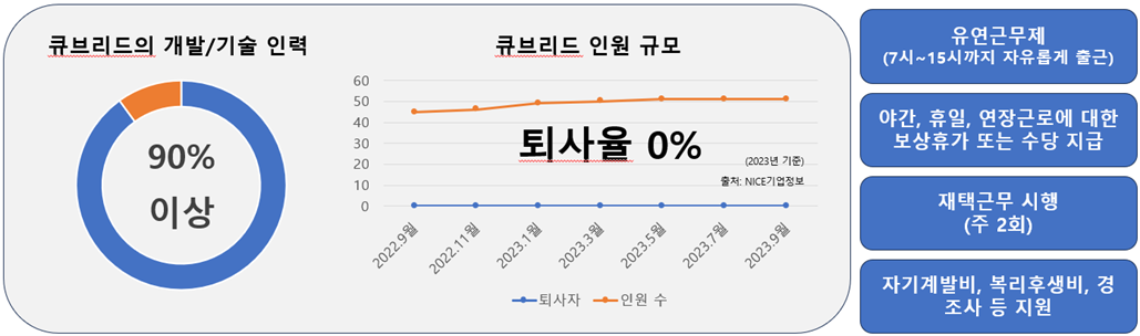 큐브리드는 오픈소스 DBMS 기업으로서 여러 면에서 매년 빠르게 성장하고 있으며, 기업 내부적으로 탄탄한 기술력을 바탕으로 건강한 기업 문화와 인원들의 근무환경 만족도에 항상 노력하고 있다. 큐브리드는 직원들의 근무환경에 대한 만족도 향상뿐만 아니라 잠재된 역량을 끌어올리고, 업무 효율성 개선으로 생산성도 높이기 위하여 유연근무제, 보상휴가 및 추가 근무 수당 지급, 재택근무 등을 시행 중이다. 2023년 기준으로 큐브리드는 1년 이상의 기간 동안 퇴사율 0%를 기록하기도 했다. 큐브리드는 앞으로도 최저 퇴사율을 지키려 노력할 것이며, 꾸준히 발전할 수 있는 기업 문화를 만들어나갈 것이다.