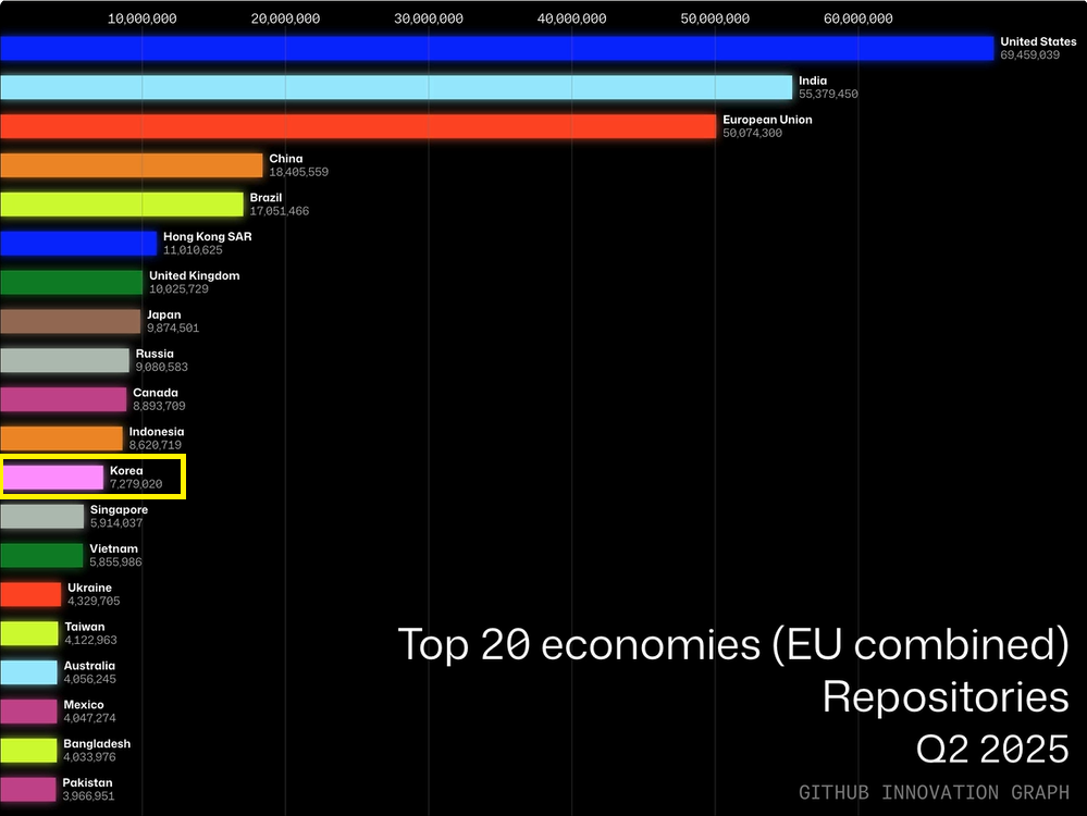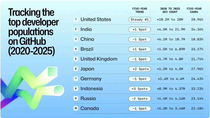 - 인도의 신규 개발자는 2025년에만 520만 명 이상이 추가되며, 깃허브 전체 신규 개발자(3,600만 명) 중 14% 이상을 차지했으며, 인도 전체 개발자 수는 2020년 450만 명에서 2025년 2,190만 명으로 증가