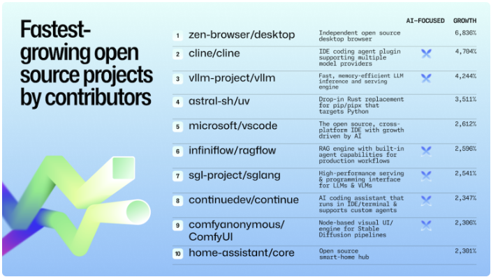 - Python은 260만 명의 기여자(약 85만 명 증가, 전년 동월 대비 +48%)를 기록하며 AI 및 데이터 과학 분야에서 여전히 우위를 점하고 있음