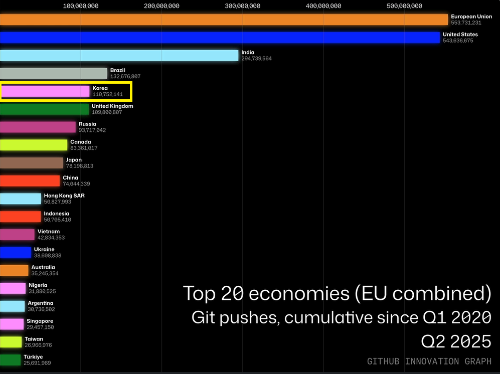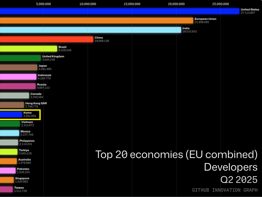 ○ 깃허브 이노베이션 그래프(Innovation Graph)를 확인해보면, 한국 개발자 수는 2020년 이후 꾸준한 연평균 증가세로 전 세계 Top 20권 내를 유지, 2025년 2분기 256만 명을 돌파하며 전체 12위를 기록