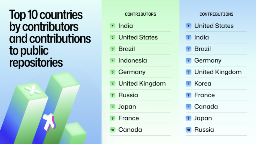 - 인도, 브라질, 인도네시아 등 주요 신흥 시장의 개발자 인구가 지난 5년간 4배 이상 증가하며 빠르게 성장하면서 글로벌 지형을 변화시킴