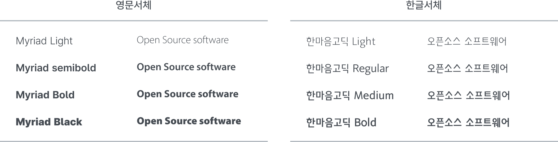 브랜드 아이덴티티의 일관적인 이미지 전달을 위해 지정서체를 사용하여야 합니다. 지정서체는 각종 응용매체에 표기되는 문자의 서체를 지정한 것으로 브랜드의 일관된 이미지를 전달하는 보조역할을 합니다.