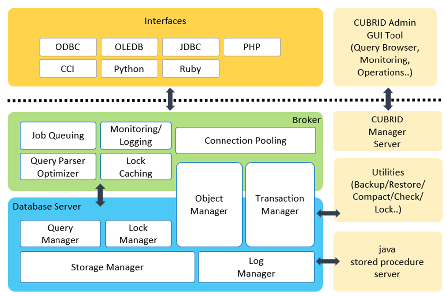 DB분야 국제 표준인 ANSI SQL을 준수하고 있으며, MVCC 지원, 고가용성을 위한 HA (High-Availability) 기능, 동기종/이기종 DB 연계를 위한 DBLink 기능, Oracle/MySQL 호환성, DB 관리 및 마이그레이션을 위한 GUI 기반의 각종 도구를 제공하고 있으며, JDBC/PHP/ODBC 등의 다양한 표준 인터페이스를 지원한다. 특히, CUBRID는 자체적으로 HA(High-Availability) 기능을 제공함으로써 서버 이중화를 통한 무정지 서비스가 가능하다.